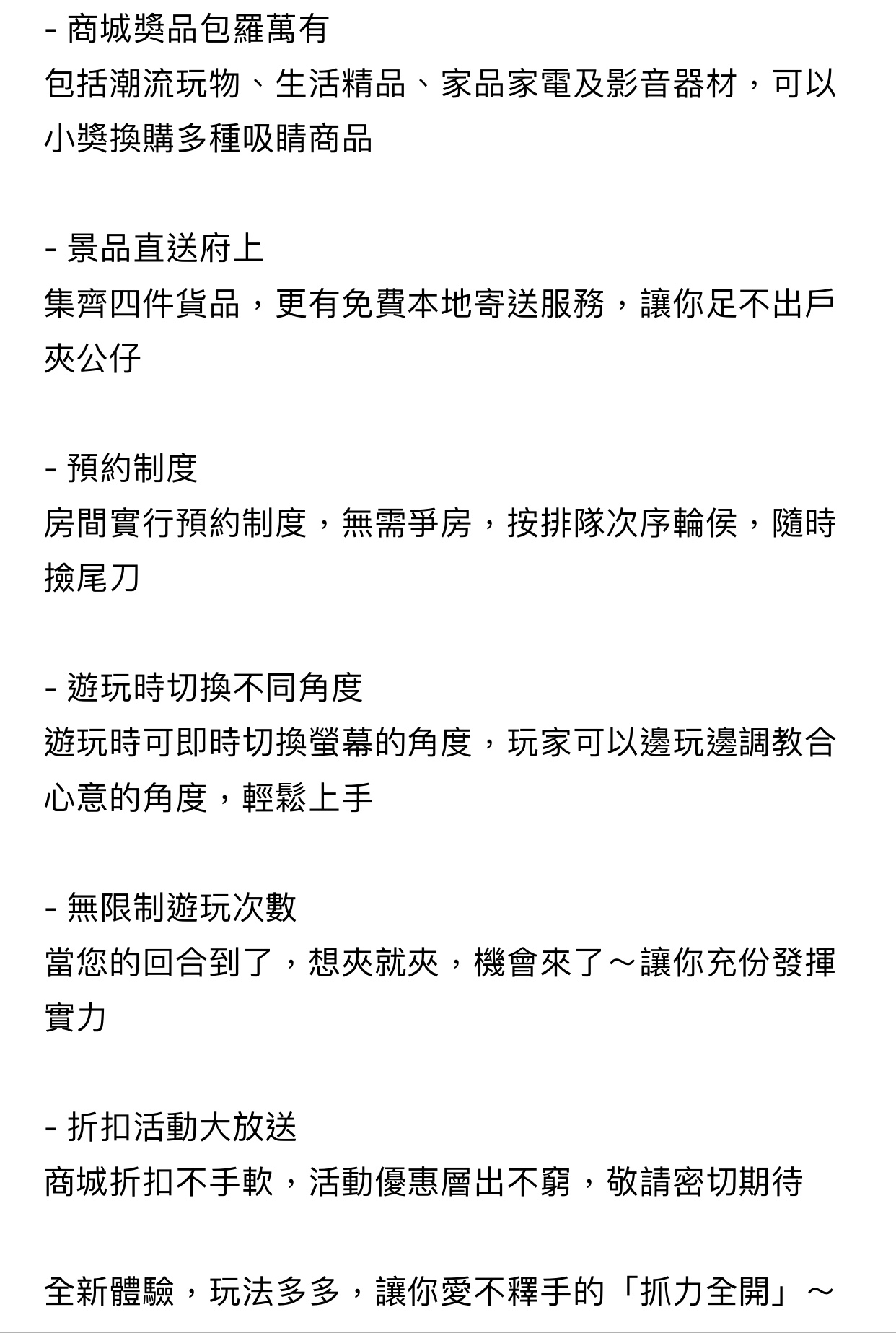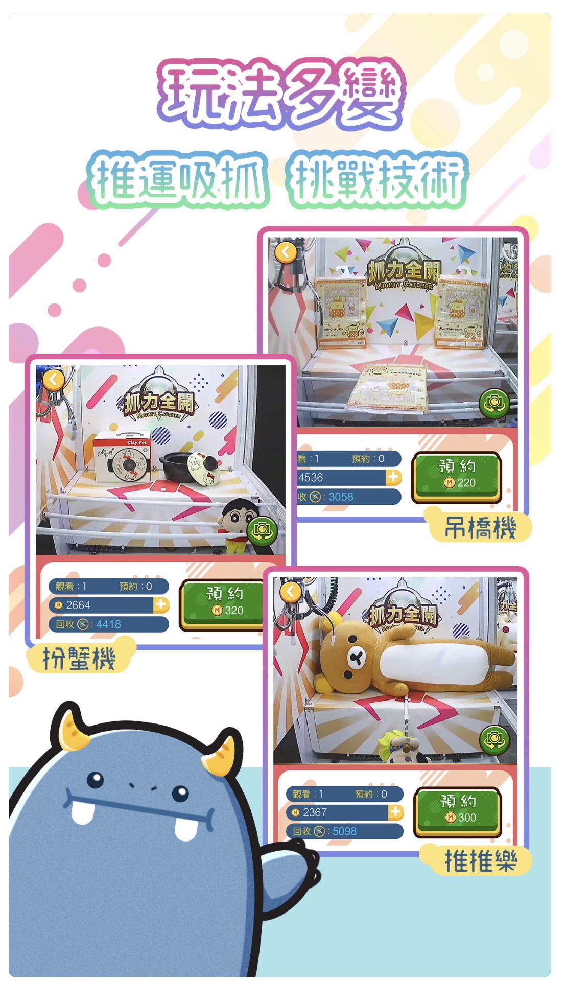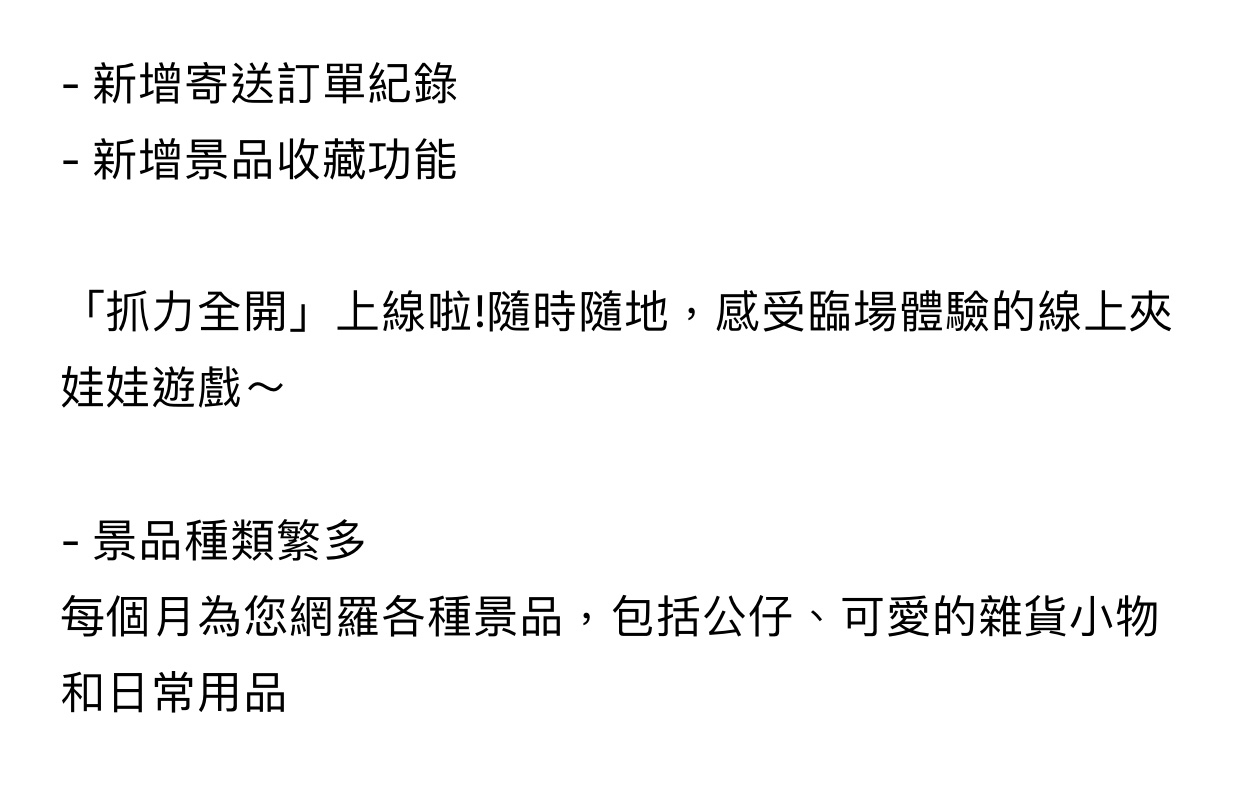 還以為夾娃娃遊戲真的只是夾 “娃娃”嗎?! 全新手遊<抓力全開> 結合夾娃娃遊戲及網上購物的創新玩法,過百種潮流玩物、生活精品、家品家電及影音器材都可以夾到,男女老幼大人小孩都可以找到喜歡的商品,發掘最新潮物玩意,抓力全開通通夾回家。一 APP 在手,隨時隨地享受購物玩樂 2 合 1 的體驗,邊玩、邊夾、邊 Shopping!